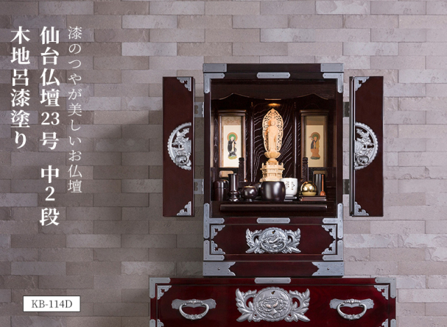 | 製品名: | 仙台仏壇 23号 中2段 KB-114D/KR-114/KEB-114 木地呂漆塗り/赤木肌木地呂塗り/朱色漆塗り/伝統色漆塗り|コンパクト ミニ仏壇 モダン仏壇 |