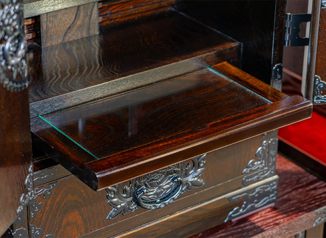 引出し材:桐(きり)無垢板塗り: 本漆 木地呂漆塗り 金具: 特製鍛造金具 - 原産国
