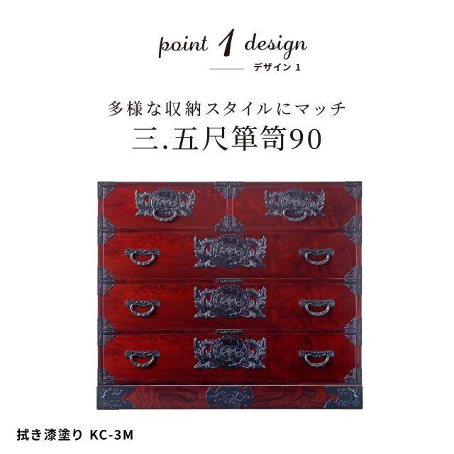 | 製品名: | 仙台箪笥 三.五尺箪笥90 KB-3M/KEB-3M/KR-3M 漆塗り(着物収納・桐タンス・洋服タンス・和風チェスト・和家具・アンティーク) |
