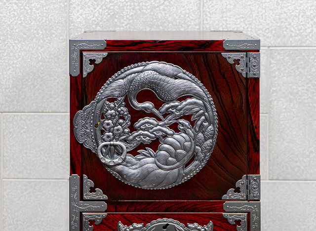 お部屋にぴったり合った家具を選んでも、お引越しや模様替えで生活空間は変わるもの。そんなときにも頼りになるのが、仙台箪笥の中でも特にスリムな「脚付すきまチェスト」です。 お客様の声から誕生したこのチェストは、ほんのわずかなすき間を有効活用できる優れもの。脚付仕様なので見た目もすっきり、床のお掃除も簡単に。限られたスペースでも快適な暮らしをサポートします。 また、豪華な飾り金具の重厚感と、全体のスタイリッシュなデザインが絶妙なバランスを生み出し、お部屋の印象をぐっと引き締めます。 今回ご紹介する「35巾 脚付すきまチェスト」は、特別仕様として片開き扉に彫金手打の金具を採用。彫金師が鉄板や銅板に、たがねと金づちで一打一打打ち込んで文様を描く、昔ながらの手仕事による逸品です。鶴・亀・松・竹・梅といった縁起の良い文様が、豪華絢爛に、そして生き生きと表現されています。 日常に寄り添いながら、和の美しさを感じさせる逸品。限られた空間にも、職人の技と心をお届けします。