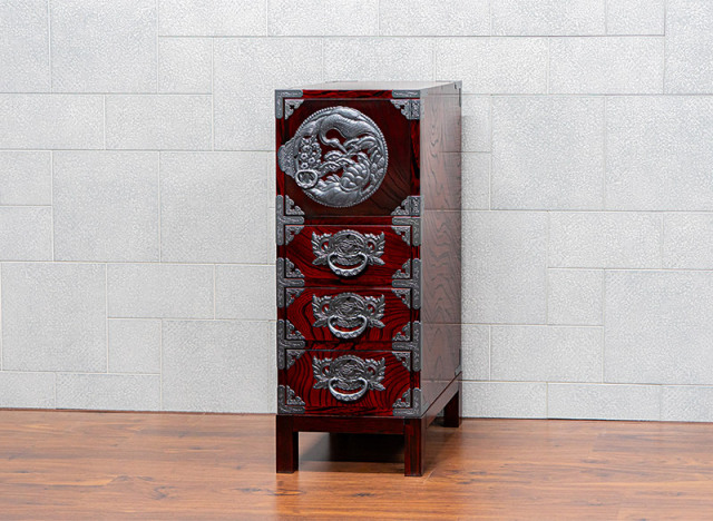 | 製品名: | 仙台箪笥 35巾脚付すきまチェスト KC-120BDH 拭き漆塗り 小田俊直作 彫金手打金具(扉) |