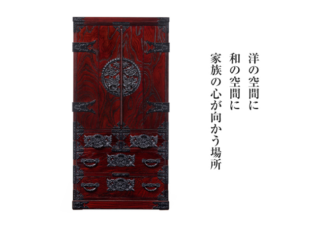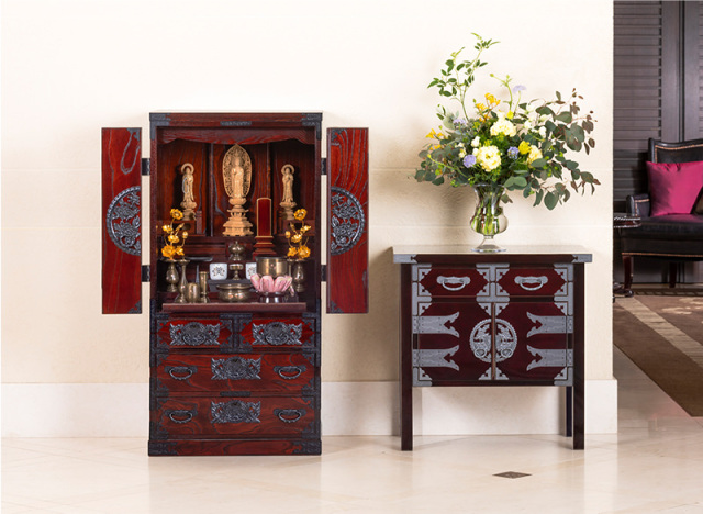 見た目の華やかさよりも、上質な素材がもつ優しさや温もりを大切な方の面影にかさねて仙台仏壇を選択される方も少なくないようです。下部には引き出しもあり、お線香やろうそく、思い出の品などを大切に収納できます。仙台箪笥の装飾をさり気なく施した職人たちの思いやりが込められた秀麗な仏壇です。杢目を活かす拭き漆塗りの仕様も味わい深い逸品です。