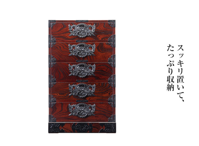 仙台箪笥には珍しい立長の箪笥です。深さのある引出しでたっぷり収納。衣類や貴重品の整理整頓に最適です。高さがありますので、インテリア小物の飾りばえもする箪笥。季節に合わせたステキな空間を演出して下さい。杢目を活かす拭き漆塗りの仕様も味わい深い逸品です。