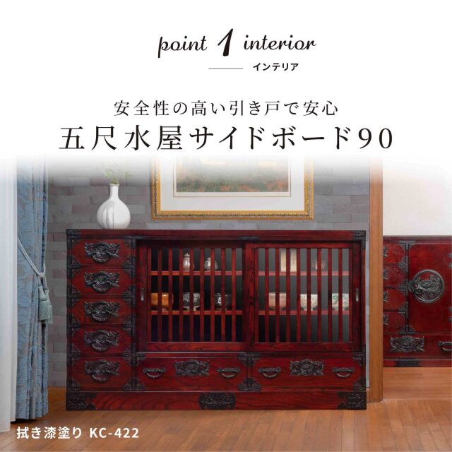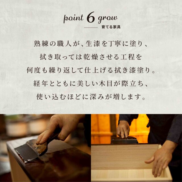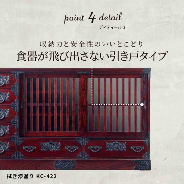 地震時にも倒れにくく、引き戸仕様で収納物が飛び出しにくい安心設計。 安定感と安全性の高さが支持されている、水屋タイプのサイドボードです。 収納力も充実。左側の五段引き出しには、カトラリーや小物類に加え、A4サイズの書類まで収納可能。 下段引き出しと合わせた全7杯の引き出しで、日用品から書類まで自然に整理整頓できます。 中央の引き戸内には、高さ調整可能な4枚の可動棚を装備。 収納する物に合わせて棚位置を変えられるため、食器や雑貨、ストック品まで幅広く対応します。 引き戸仕様なので、開閉時に場所を取らない点も魅力です。 高さは約90cm。天板に花瓶やインテリアを飾っても圧迫感がなく、空間にほどよいアクセントを与えます。 デザインは、和の趣と現代的な感覚を融合した和モダンスタイル。 和室・洋室どちらにもなじみ、住まいの雰囲気を上品に引き立てます。 仕上げには、木の杢目を活かした拭き漆塗りを施し、使い込むほどに深みが増す味わい深い一台です。 ※本ページは【拭き漆塗り】仕様です。 鏡面仕上げ(木地呂漆・朱色漆・赤木肌木地呂漆・黒呂漆・藍色漆・常盤色漆)をご希望の場合はお見積もりいたします。