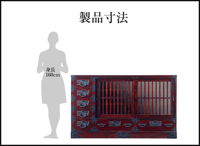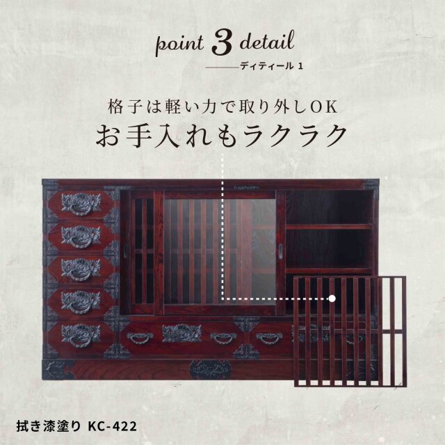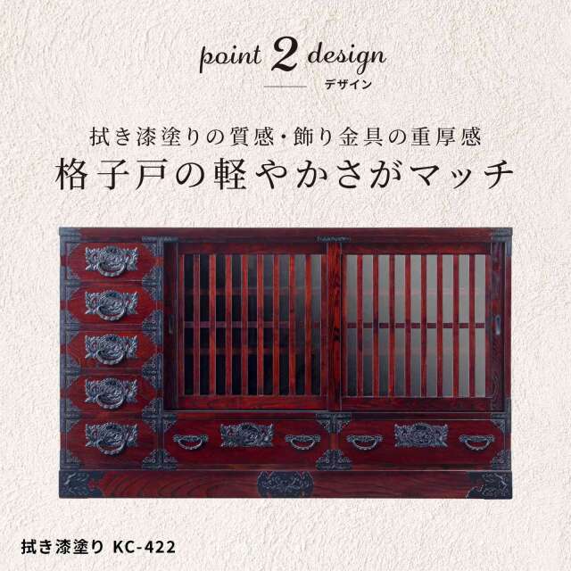 | 製品名: | 仙台箪笥 五尺水屋サイドボード KC-422 拭き漆塗り(食器棚・桐タンス・リビングボード・和家具・アンティーク) |