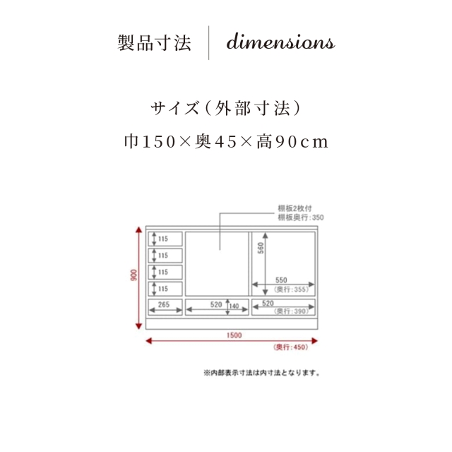 - 【外部寸法】巾150×奥45×高90cm