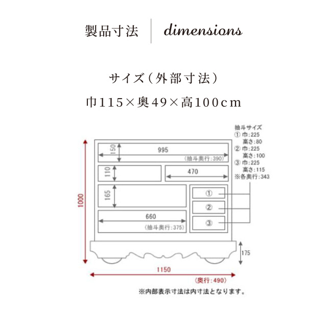 - 【外部寸法】巾115×奥49×高100cm