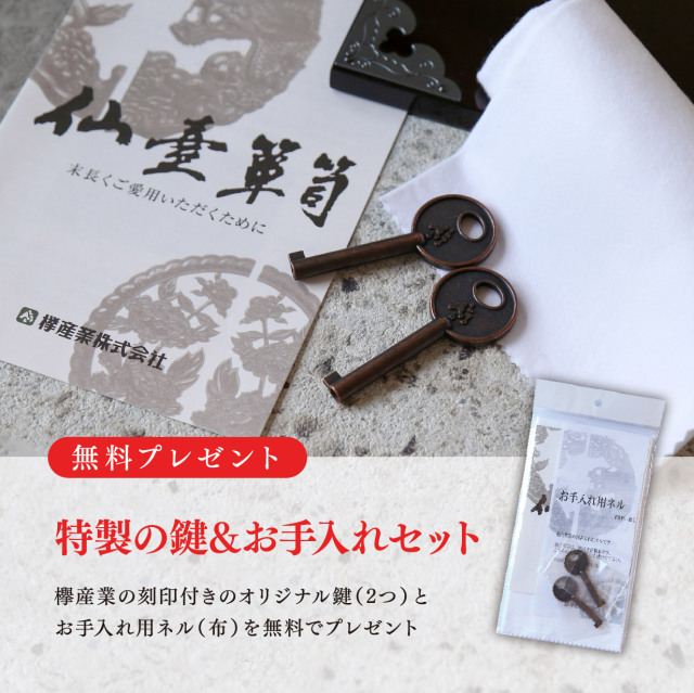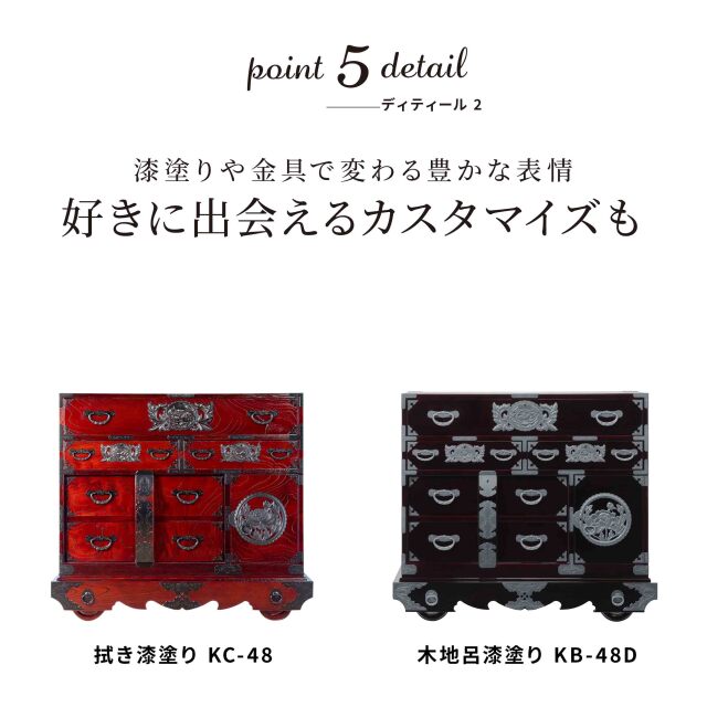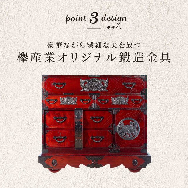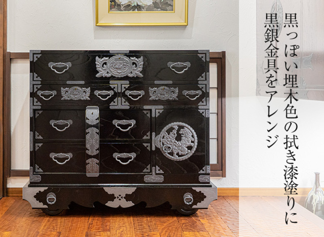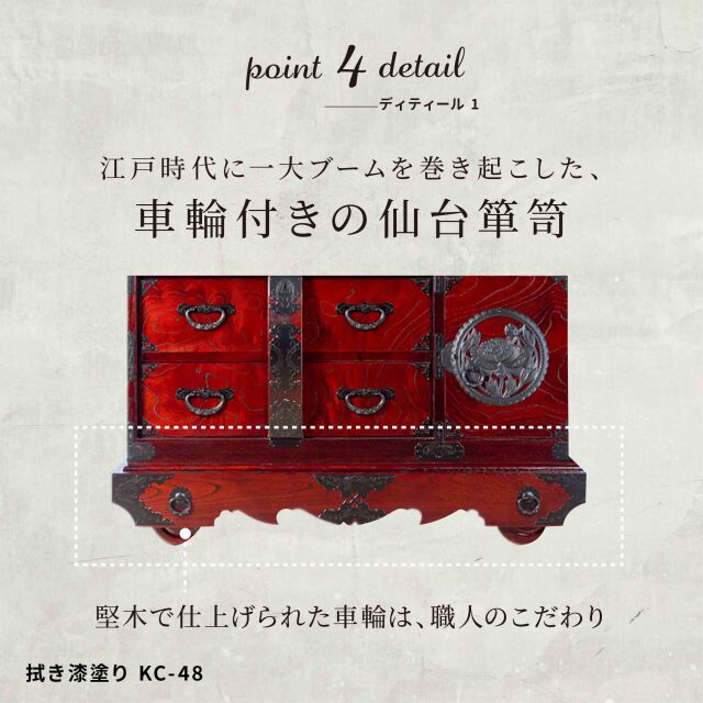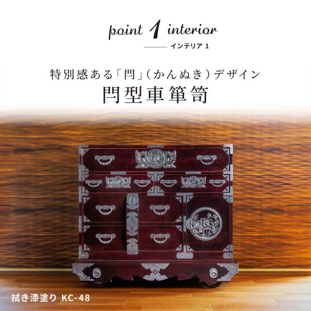 閂(かんぬき)とは、門や建物の出入り口の扉を閉ざす為の横木の事です。閂や車部分の装飾性は大変印象的で、歴史的に長く親しまれてきました。塗りは仙台箪笥人気の木目が美しい拭き漆塗り仕上げ。豊富にあしらわれたオリジナル鍛造金具が箪笥に新たな立体感を与え、お部屋の雰囲気を高めてくれます。杢目を活かす拭き漆塗りの仕様も味わい深い逸品です。