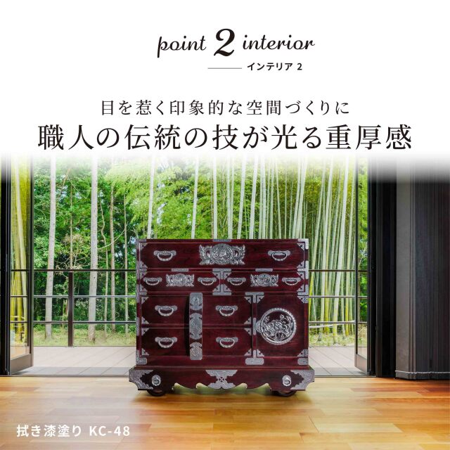 | 製品名: | 仙台箪笥 閂型車箪笥 KC-48 拭き漆塗り(桐タンス・整理タンス・和風チェスト・和家具・アンティーク) |