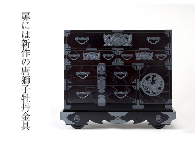 引出し材:桐(きり)無垢板塗り: 本漆 拭き漆塗り 金具: オリジナル鍛造金具 - 原産国