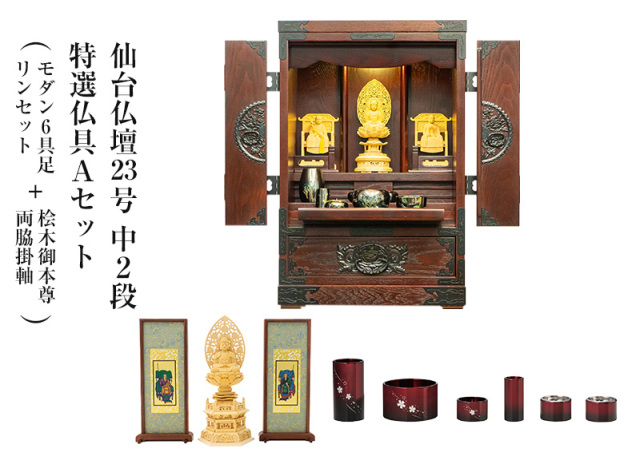 | 製品名: | 仙台仏壇23号 中2段 特選仏具Aセット(モダン6具足・リンセット(ホープ または フルーム)+桧木御本尊・両脇掛軸)|コンパクト ミニ仏壇 モダン仏壇 |