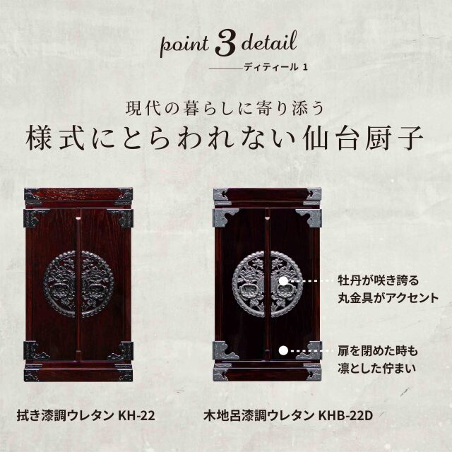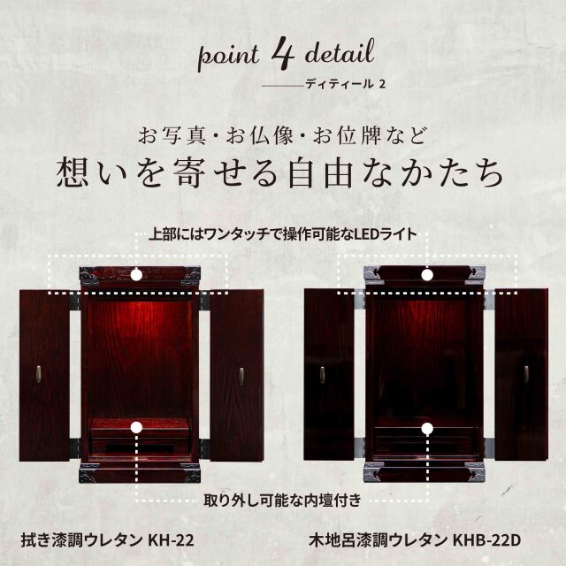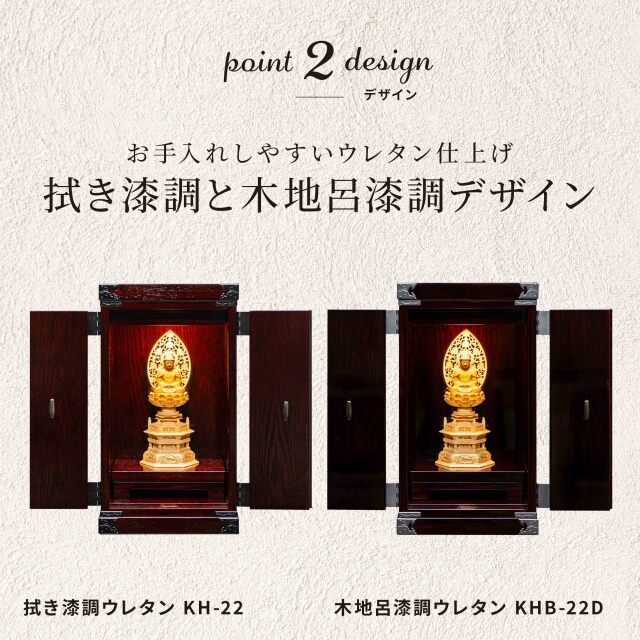 【期間限定|25%OFFクーポン対象】 クーポンコード:keyaki25 使用期限:4月30日(水)23時まで 現代の暮らしにやさしく溶け込む、コンパクトで上品な二枚扉の仙台厨子。 様式にとらわれず、大切な方のお写真やお仏像、お位牌などを、思いのままに祀り、祈りを捧げていただけます。 「自由なかたちで想いを寄せたい」そんなお声から生まれた一台です。 塗装は木地呂漆の風合いを残しつつ、表面をウレタンで仕上げているため、お手入れも簡単。日常に寄り添いながら、長く美しさを保ちます。 巾25cm・奥行20cmの小ぶりなサイズは、和室にも洋間にも自然に馴染み、置き場所を選びません。二枚扉を開ければ、祈りの空間が静かに広がります。 上部にはLEDライトを備え、お仏像やお位牌をやさしく照らします。さらに扉内の台は取り外し可能で、祀り方に合わせて柔軟にお使いいただけます。 ※本ページは鏡面仕上げの【木地呂漆調】仕様です。 【拭き漆調】は別ページにて販売しております