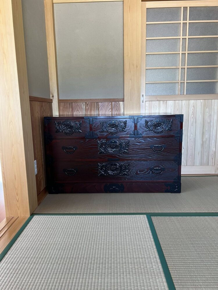 落ち着いた雰囲気の和室に、重厚感のある「四尺刀箪笥」がしっくりと溶け込み、空間を引き締めています。