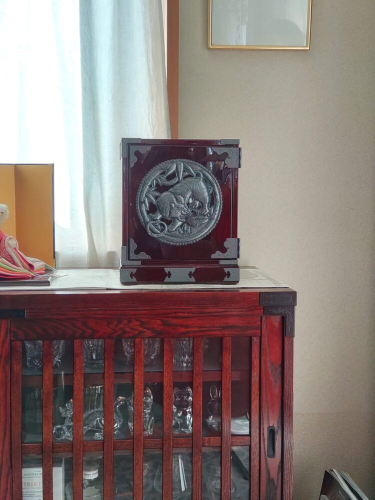 先日、宮城県A様へ「舟箪笥〈木地呂漆塗り〉KM-1DH」をお届けいたしました。扉には「竹に虎」をあしらった彫金手打ち金具を用いており、力強さと品格が調和した一台です。
