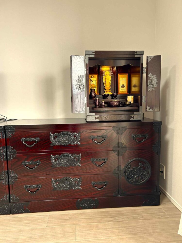 仙台仏壇と合わせて仙台箪笥のロータイプをデザイン違いで壁際にオーダー頂きました。