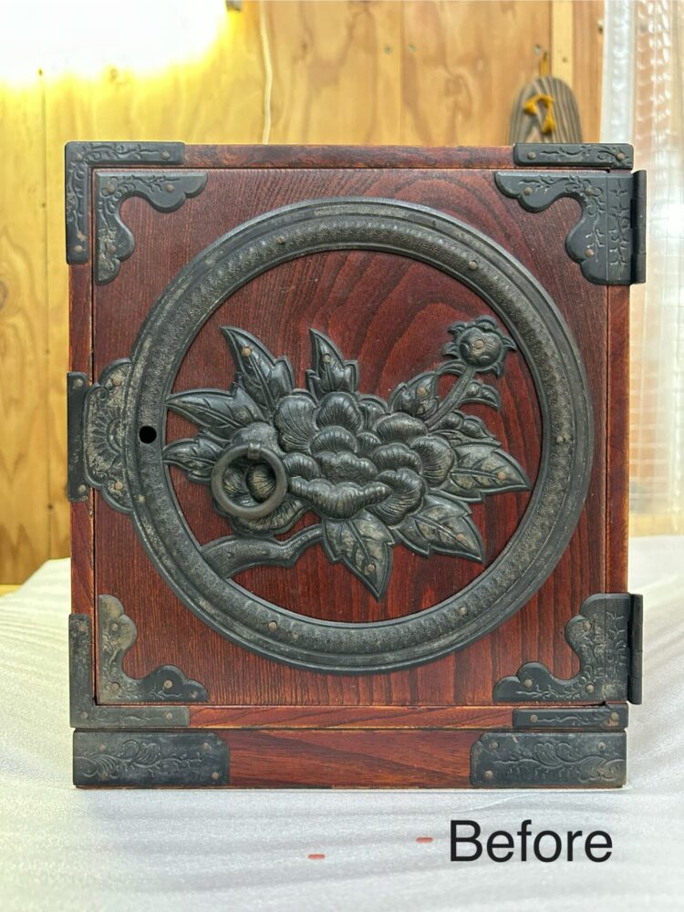 お母様が使っていた小箪笥で、金具が錆びて漆もくすんできたとの事で金具の錆び取り仕上げ直しと漆の塗り直しをご依頼頂きました。