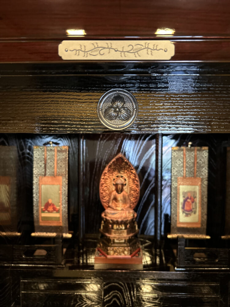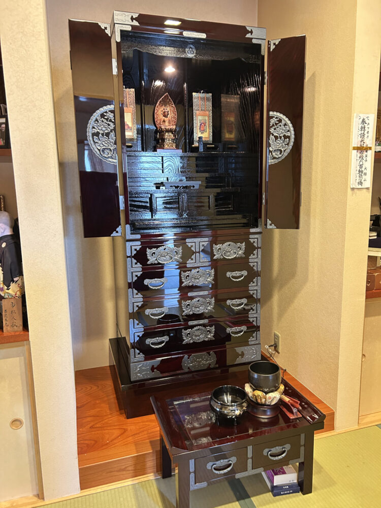 数か月かけて完成した木地呂漆塗りの「仏壇55号」はY様のご要望で特注の仏壇台を設置しました。巾も高さもぴったりでした。お仏壇の上部に彫金の家紋もございます。
