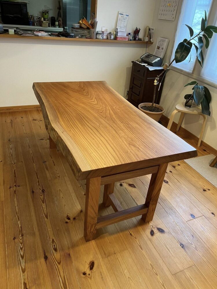 宮城県S様邸。欅ならではの力強く美しい木目が際立つ一枚板は、空間に自然と馴染みながらも、確かな存在感を放ちます。