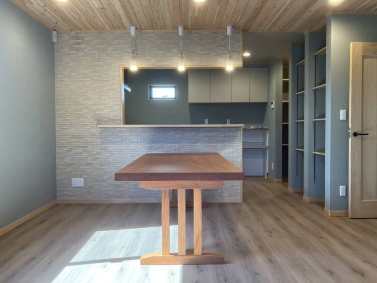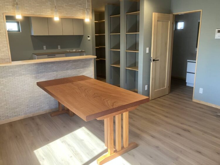 欅ならではの力強く美しい木目が際立つ一枚板は、空間に自然と馴染みながらも、確かな存在感を放ちます。
