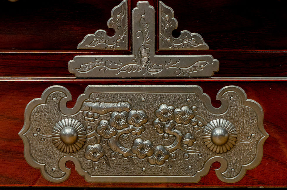 閂がかけられた抽斗の金具の図柄は8種類ともすべて柄が異なる「梅花」「菊花」のアレンジです。