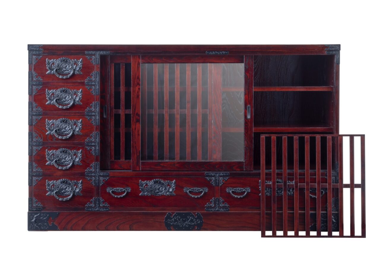格子戸や引き戸、重ね構造など独特の設計を持ち、食器棚としての機能性と意匠性を兼ね備えています。